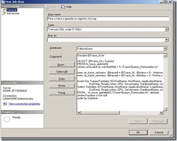 Você deve criar um Job no Management Studio com o nome “DBA – Trace Querys Demoradas” e esse job deve possuir 3 steps.