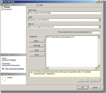 1. Daniel, esta dificuldade ocorre quando executa o STEP1 e ocorre um erro no STEP2, pois o comando “del C:\Trace\Querys_Demoradas.trc /Q”, tem que estar sem as aspas (“) para executar.