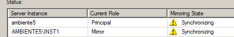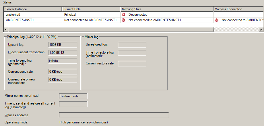 Nesse teste foi simulada uma falha com a parada do serviço do SQL Server do servidor A (Principal). Após a parada do servidor, o monitor do Mirror fica como abaixo: