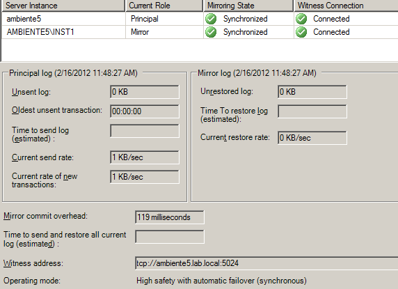 Com um database mirroring configurado com o modo High Safety with Automatic Failover conforme pode ser visto abaixo: