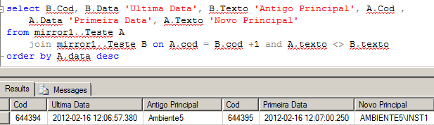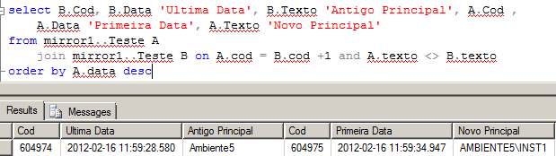 Dessa forma, como a coluna Texto possui o nome do servidor onde o insert foi executado, é possível medir o tempo de failover entre as duas instancias. Para isso, foi verificado quando a coluna Texto troca o nome do servidor e assim podemos saber a última inserção em um ambiente e a primeira inserção em outro ambiente.