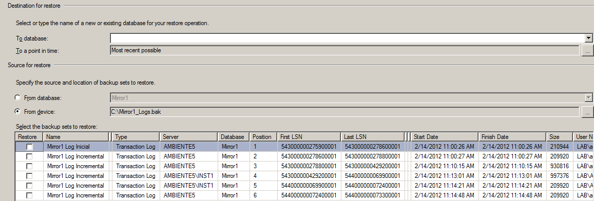 Para finalizar o teste, foi realizado um restore do backup full realizado no Passo 1 do teste em uma database chamada “Mirror2” seguido de um restore dos 6 backups do log da figura acima.