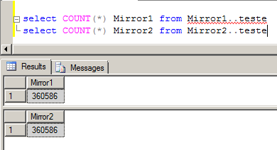 Como pode ser visto na figura abaixo, a tabela onde os inserts foram realizados possui o mesmo número de registros na base restaurada (Mirror2), ou seja, os backups do log foram todos aplicados com sucesso na operação de restore.