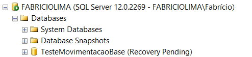 Contudo, as bases que precisei mover estavam fora, pois o SQL tinha conhecimento que elas estavam em um local, mas eu alterei esse local com o serviço parado. Dessa forma, a base subiu com o Status Recovery Pending.