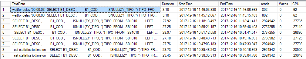 Olhando no Trace de queries demoradas, a query ficou tão rápida que tenho que apelar e colocar um waitfor delay para poder visualizar e comparar: