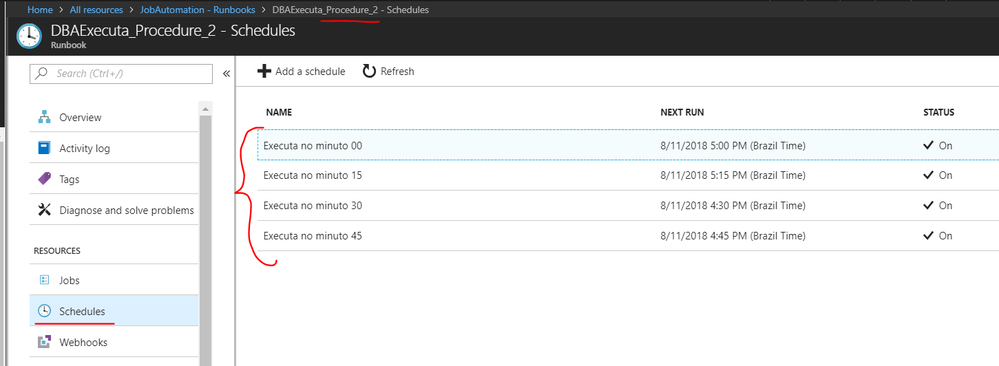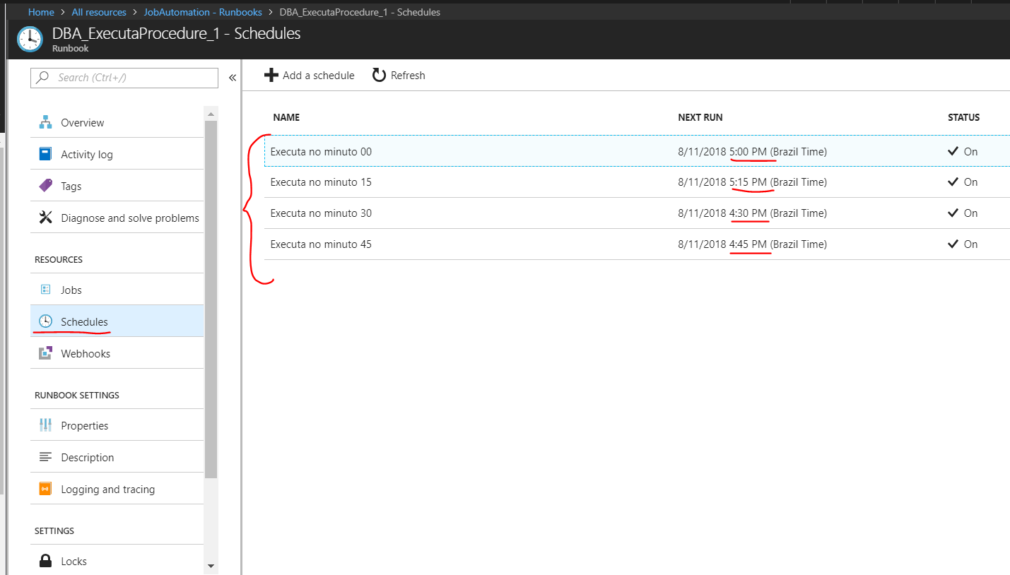 Clicando em Schedule desse Runbook 2, conseguimos ver novamente os 4 agendamentos: