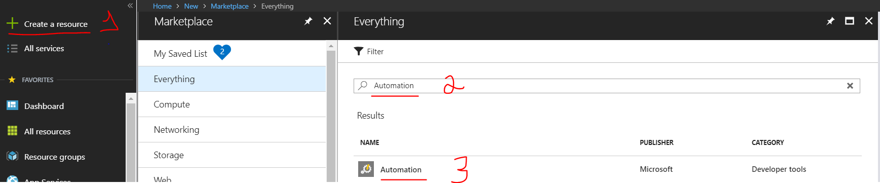 Clique em Create a resource -> Procure por “Automation” -> Clique em Automation -> Create