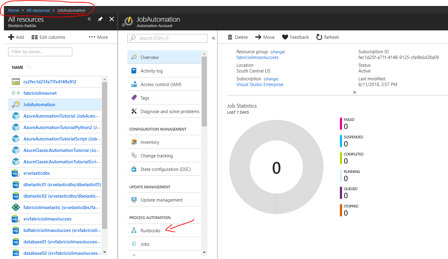 Repare que tem uma opção chamada Runbooks. É ali que vamos clicar no próximo passo.