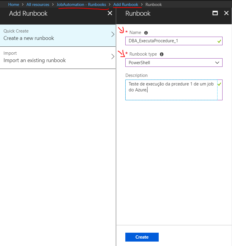 Clique em Runbook (conforme foto anterior) -> Clique em Add a runbook -> Create a new runbook -> Escolha um nome para o seu Runbook -> Em Runbook type coloque PowerShell -> Descrição -> Create