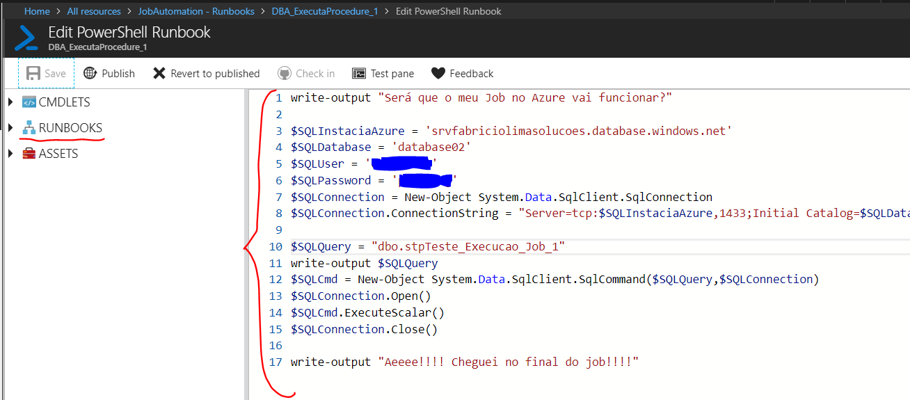 Repita o passo 2 para criar um segundo runbook para chamar a procedure stpTeste_Execucao_Job_2.