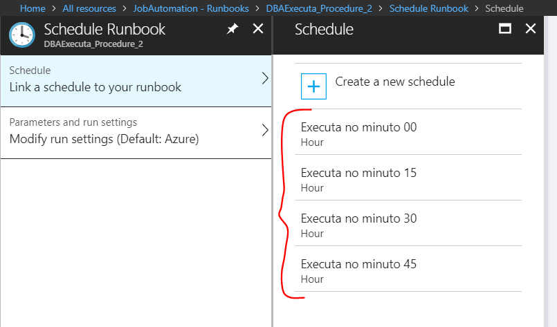 Clique no Runbook 2 -> Clique em Schedule -> Link a schedule to your runbook -> Escolha um dos agendamentos que criamos para o job anterior -> Clique em ok