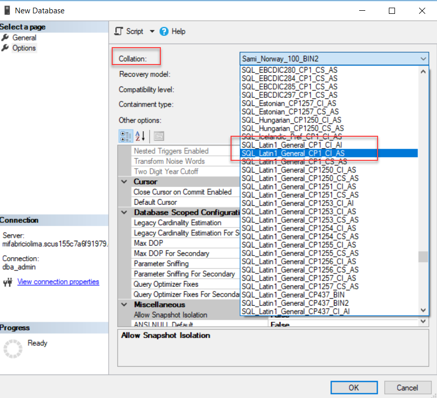 Na criação de uma base de dados conseguimos escolher sem problema a Collation que queremos: