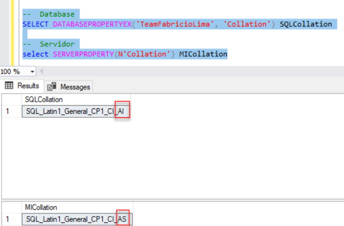 -- Database SELECT DATABASEPROPERTYEX('TeamFabricioLima', 'Collation') SQLCollation -- Servidor select SERVERPROPERTY(N'Collation') MICollation |