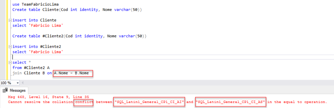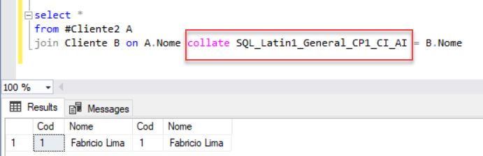 use TeamFabricioLima Create table Cliente(Cod int identity, Nome varchar(50)) insert into Cliente select 'Fabricio Lima' Create table #Cliente2(Cod int identity, Nome varchar(50)) insert into #Cliente2 select 'Fabricio Lima' select * from #Cliente2 A join Cliente B on A.Nome = B.Nome |