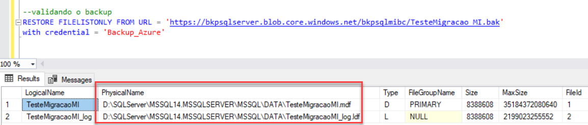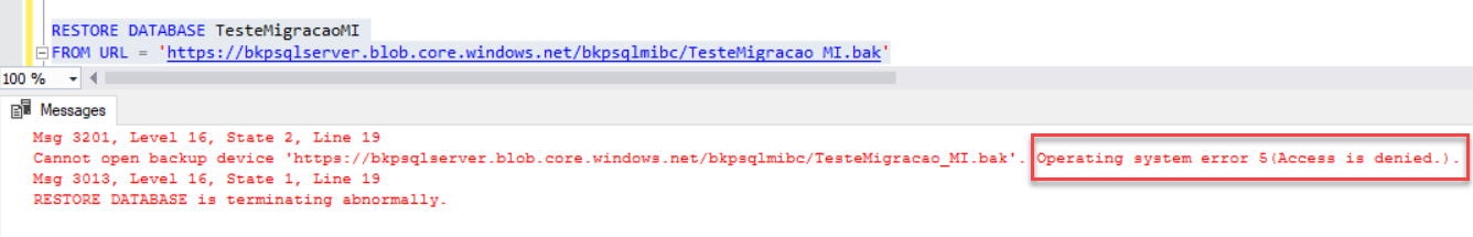 backup database TesteMigracaoMI to url = 'https://bkpsqlserver.blob.core.windows.net/bkpsqlmibc/TesteMigracao_MI.bak' with compression,credential = 'Backup_Azure' |