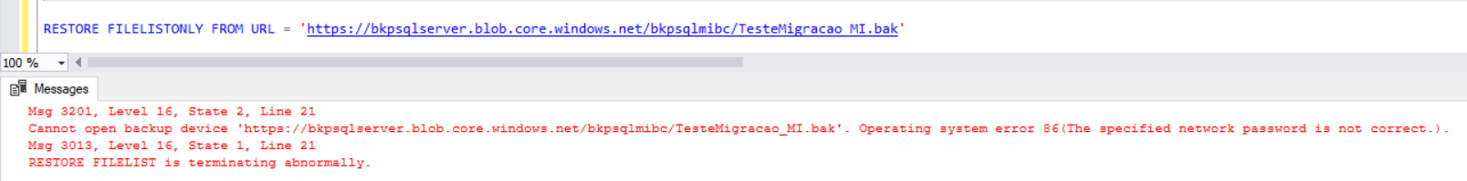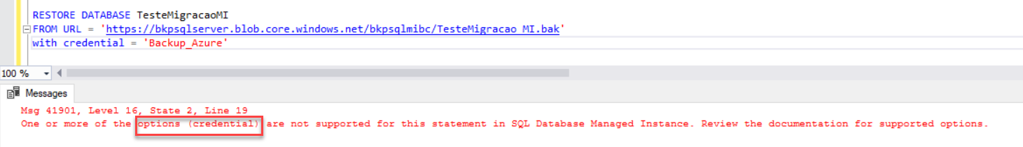 Se tentar restaurar sem a opção WITH CREDENTIAL gera o erro abaixo: