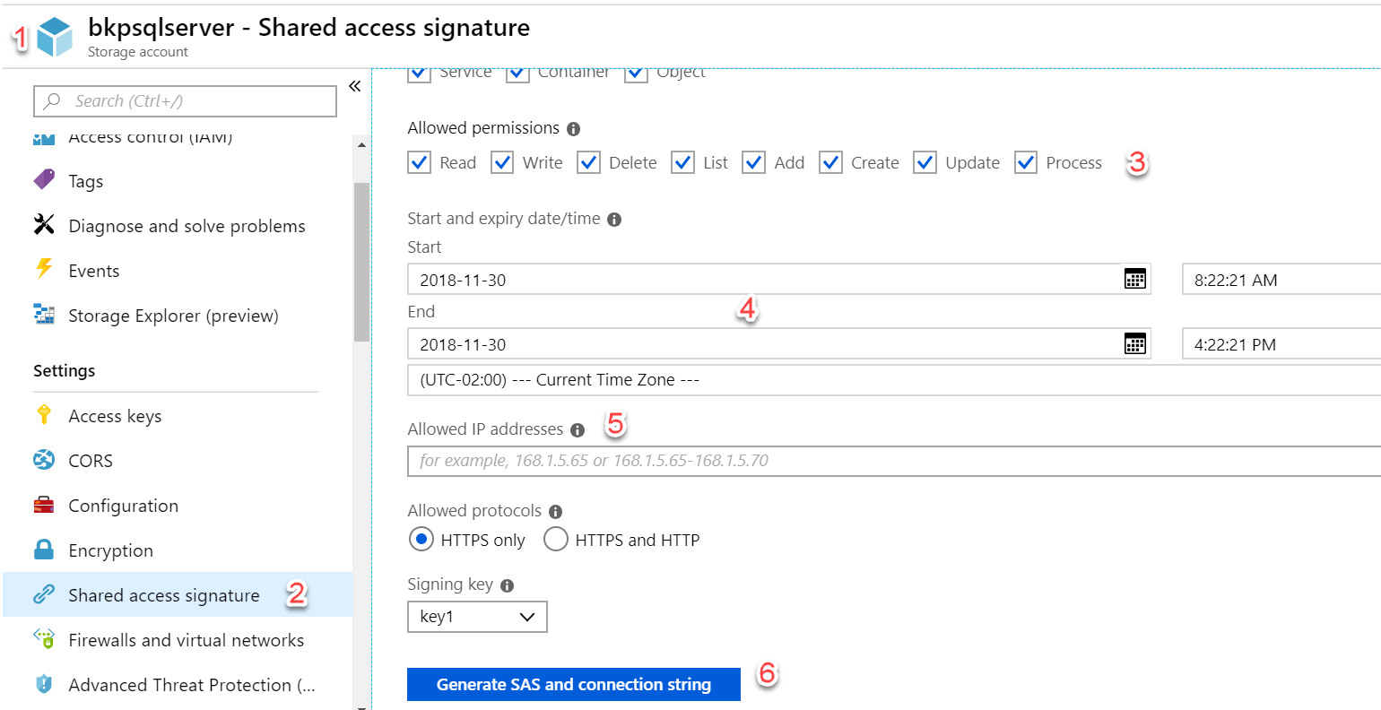 Temos que usar uma chave Shared Access Signature (SAS) para ler o backup da Storage account: