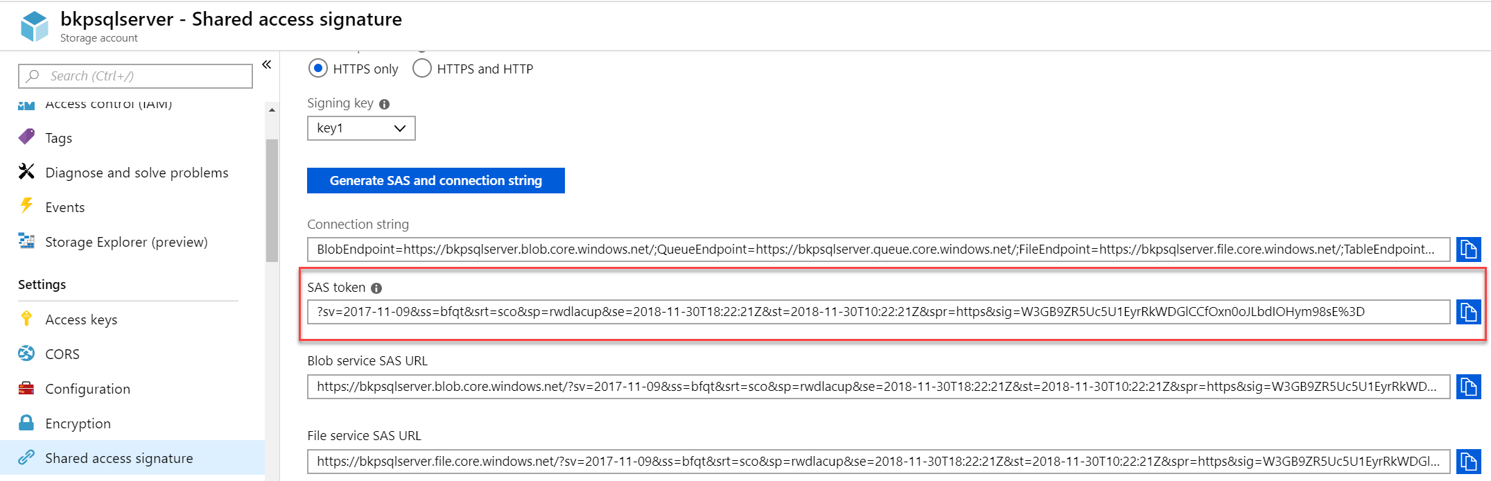 CREATE CREDENTIAL [Backup_Azure_SAS] WITH IDENTITY = 'Shared access signature' , SECRET = 'sv=2017-11-09&ss=bfqt&srt=sco&sp=rwdlacup&se=2018-11-30T18:22:21Z&st=2018-11-30T10:22:21Z&spr=https&sig=W3GB9ZR5Uc5U1EyrRkWDGlCCfOxn0oJLbdIOHym98sE%3D' |