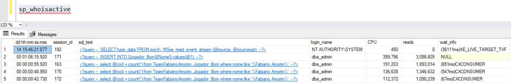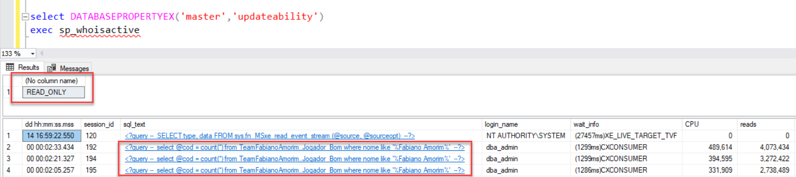 Segue abaixo uma foto da Whoisactive com essas queries sem execução na minha instância de produção:
