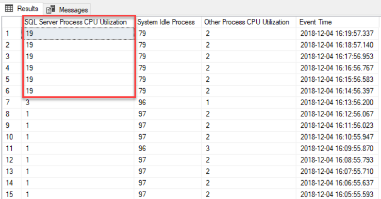 -- Get CPU Utilization History for last 256 minutes (in one minute intervals) (Query 46) (CPU Utilization History) DECLARE @ts_now bigint = (SELECT cpu_ticks/(cpu_ticks/ms_ticks) FROM sys.dm_os_sys_info WITH (NOLOCK)); SELECT TOP(256) SQLProcessUtilization AS [SQL Server Process CPU Utilization], SystemIdle AS [System Idle Process], 100 - SystemIdle - SQLProcessUtilization AS [Other Process CPU Utilization], DATEADD(ms, -1 * (@ts_now - [timestamp]), GETDATE()) AS [Event Time] FROM (SELECT record.value('(./Record/@id)[1]', 'int') AS record_id, record.value('(./Record/SchedulerMonitorEvent/SystemHealth/SystemIdle)[1]', 'int') AS [SystemIdle], record.value('(./Record/SchedulerMonitorEvent/SystemHealth/ProcessUtilization)[1]', 'int') AS [SQLProcessUtilization], [timestamp] FROM (SELECT [timestamp], CONVERT(xml, record) AS [record] FROM sys.dm_os_ring_buffers WITH (NOLOCK) WHERE ring_buffer_type = N'RING_BUFFER_SCHEDULER_MONITOR' AND record LIKE N'%<SystemHealth>%') AS x) AS y ORDER BY record_id DESC OPTION (RECOMPILE); |
