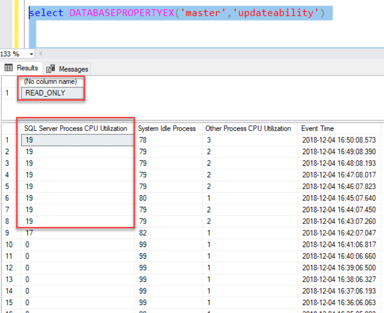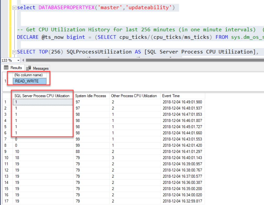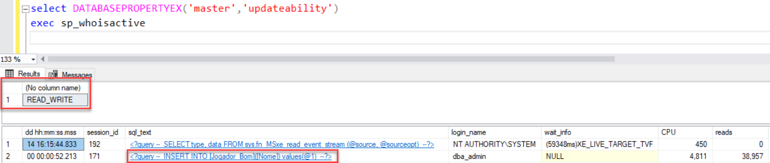 Repare que com a função DATABASEPROPERTYEX consigo provar que estou conectado na instância READ_WRITE.