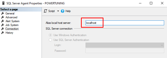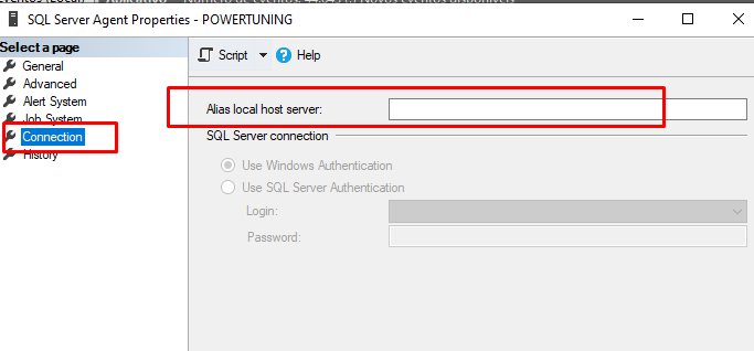 Eu verifiquei o Agent em vários servidores nos meus clientes e todos estão com essa opção em branco mesmo. Mas nunca passei pelo problema de não subir a conexão. Geralmente coloco um usuário do domínio no serviço do Agent, inclusive para usar o mesmo no servidor de Mirror.
