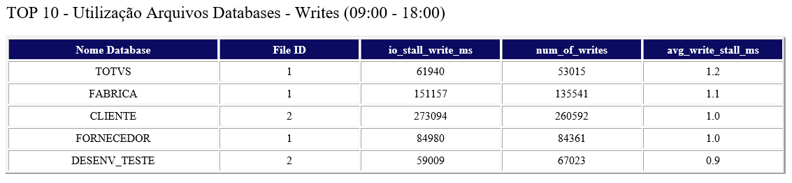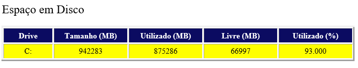 2. Informações sobre espaço em disco das bases.