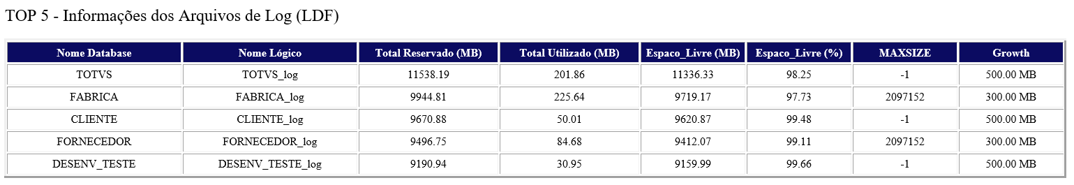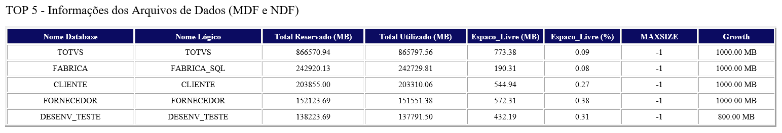 3. Informações sobre os arquivos MDF. É possível ver se ele já está no limite de crescimento e pode causar uma parada do banco de dados.