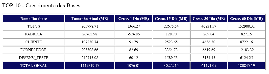 5. Monitoramento do crescimento das databases nos últimos 1, 15, 30 e 60 dias.