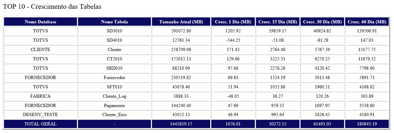 6. Monitoramento do crescimento das tabelas nos últimos 1, 15, 30 e 60 dias.