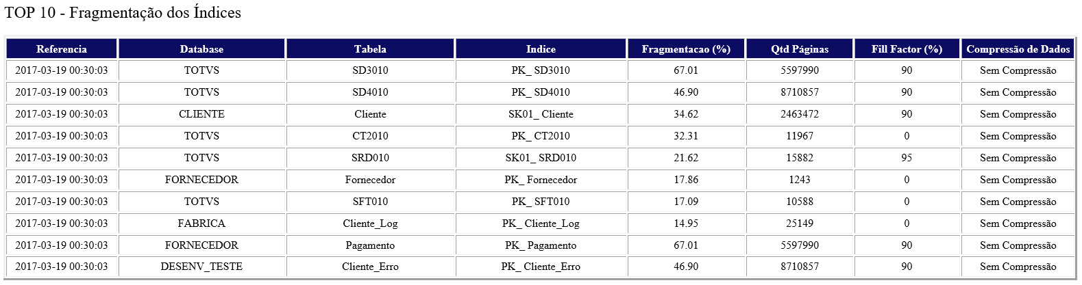 19. Acompanhamento de como está a Fragmentação de índices das tabelas.