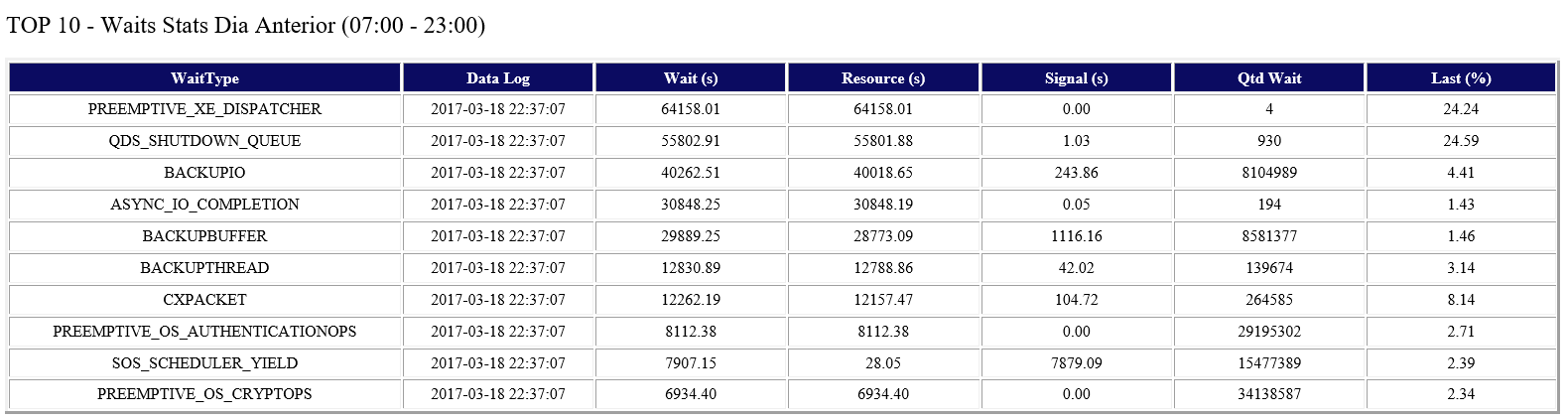 20. Acompanhamento dos maiores Waits do Banco de Dados no dia anterior.