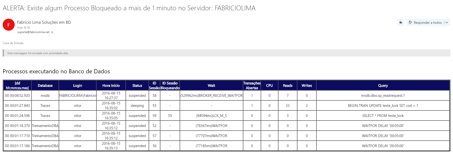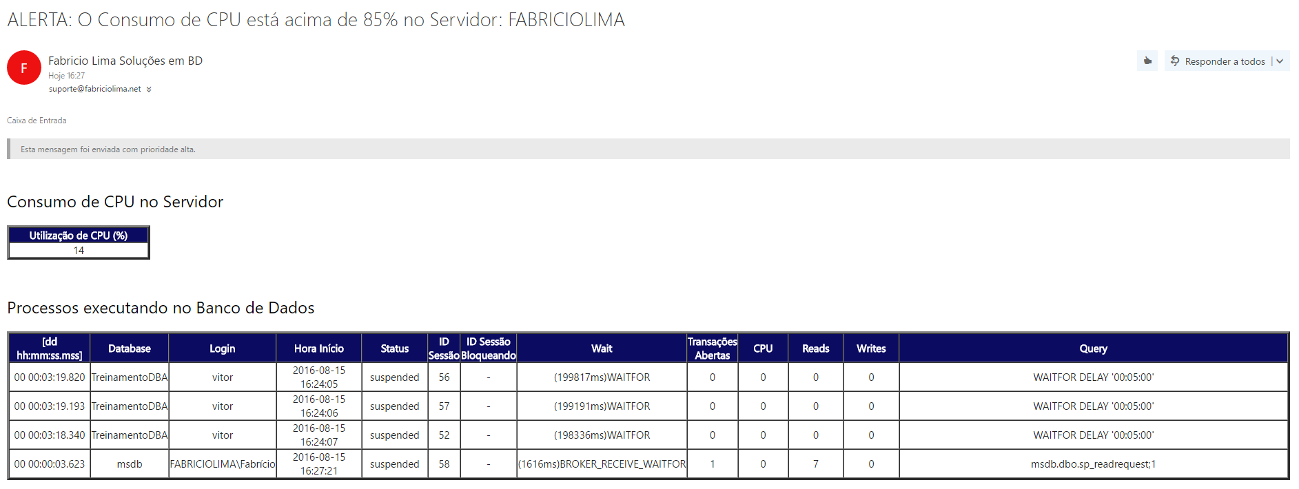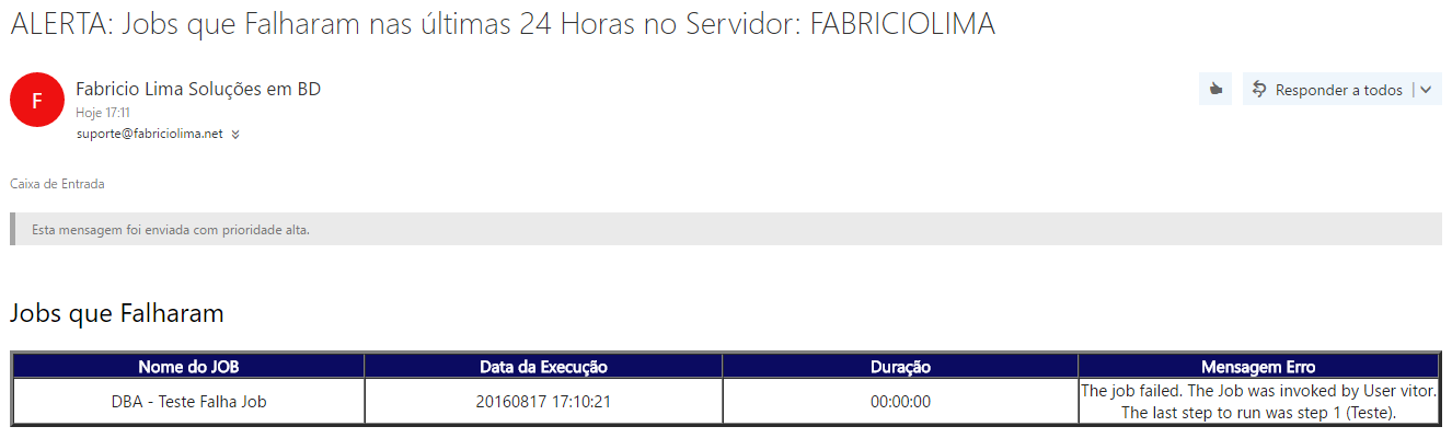 Sou certificado Sql Server, porém, eu tenho dúvidas com relação a alertas e Jobs. Eu tenho interesse em um treinamento direcionado a estes dois itens. Você teria um tempo para conversarmos a respeito.