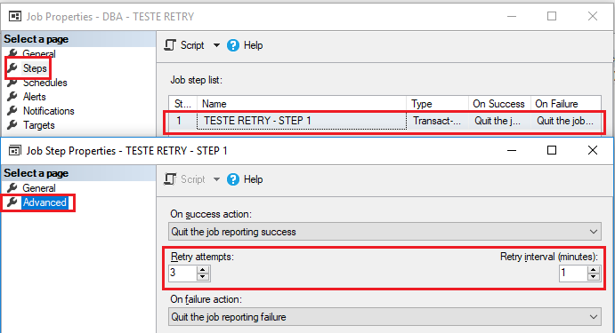 No caso do JOB do Backup, utilizamos 3 tentativas e um intervalo de 1 hora entre as execuções. Dessa forma, o problema será resolvido automaticamente sem precisar de intervenção manual (custo $$$).