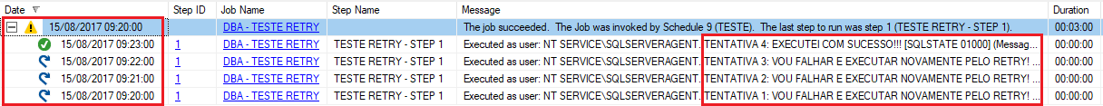 • Repare como fica o History do JOB. Apesar de executar com sucesso na última tentativa, o histórico fica com uma exclamação por ter utilizado o RETRY.